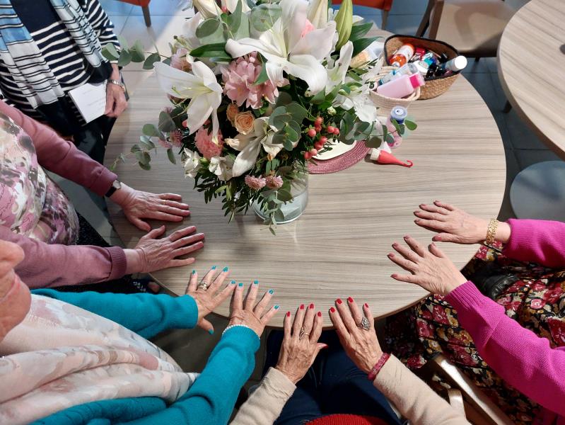 Autour d’une table joliment fleurie, nos résidentes se retrouvent pour un atelier beauté placé sous le signe de la convivialité et du bien-être. Les mains sublimées par de belles manucures colorées témoignent de ce moment privilégié, où chacune prend soin d’elle tout en partageant un instant chaleureux avec les autres.
